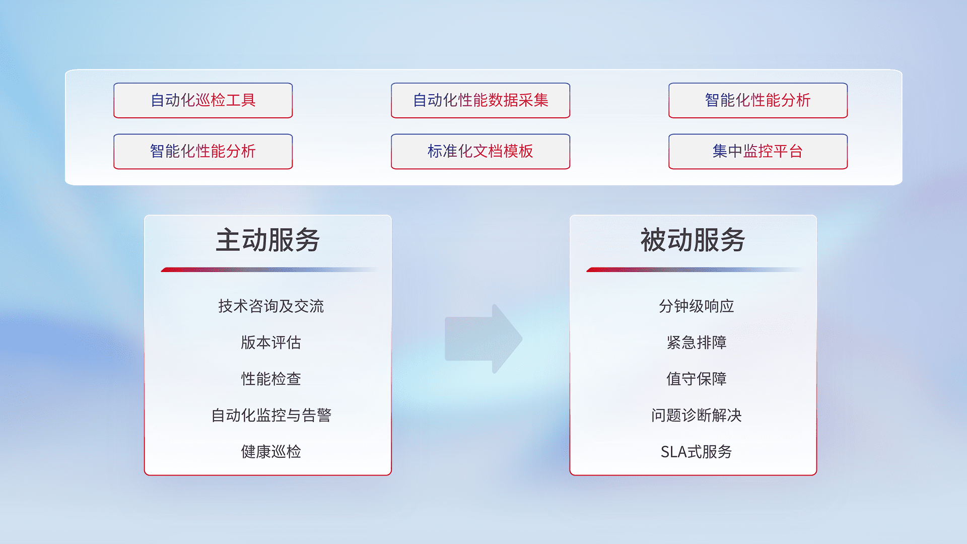智能化工具和标准化文档,,,保障服务质量,,,提供主动服务(包含技术咨询、、、版本评估、、性能检查、、、、自动化监控与告警、、、健康巡检)和被动服务包含(分钟级响应、、、、紧急排障、、值守保障、、问题诊断解决、、、、SLA服务)。。。。