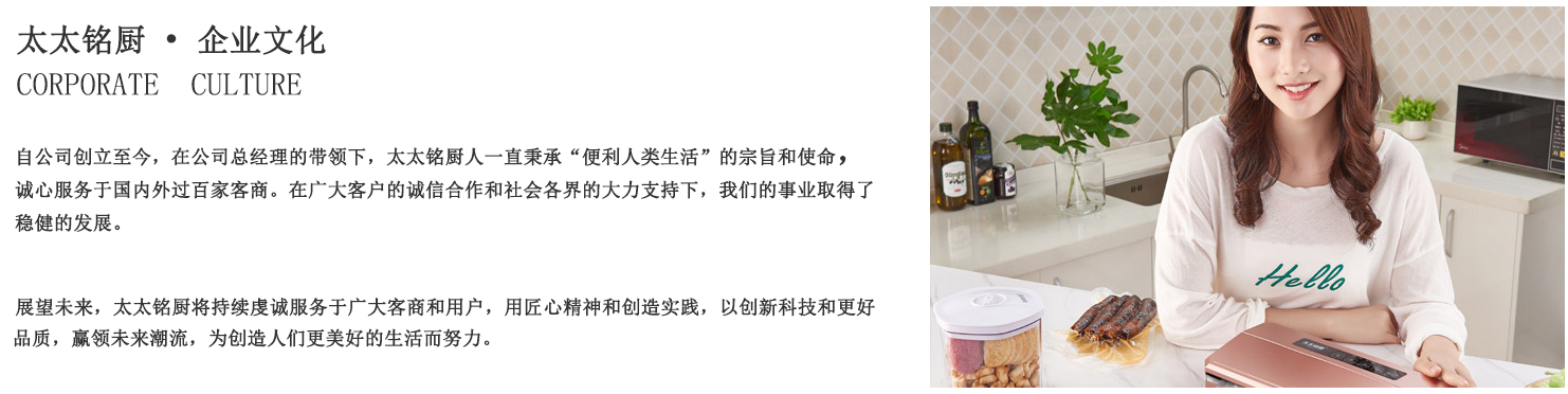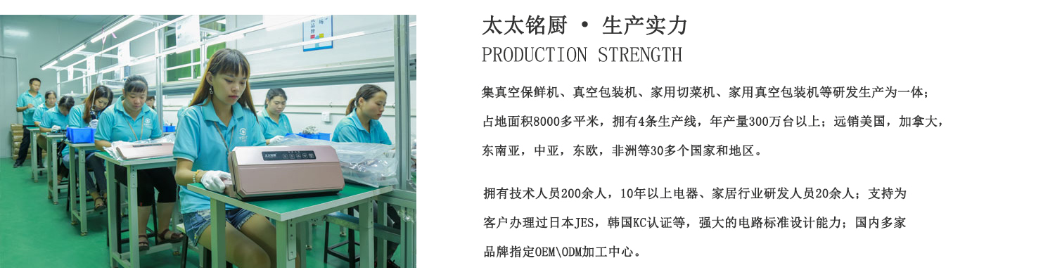 太太铭厨是尊时凯龙人生就博控股集团旗下家电品牌,是一家集研发、生产、销售于一体的综合性企业。工厂位于东莞市常平镇,厂房面积8000多平方米, 现有职工200多人,专业技术人员23人。专注于研发、制造家用真空包装机,切菜机等厨房智能电器,为全球品牌家电厂家OEM及定制服务,为厨房家电用户提供更好产品。产品远销销售于欧美、巴西、日本、俄罗斯及东南亚等国家地区。